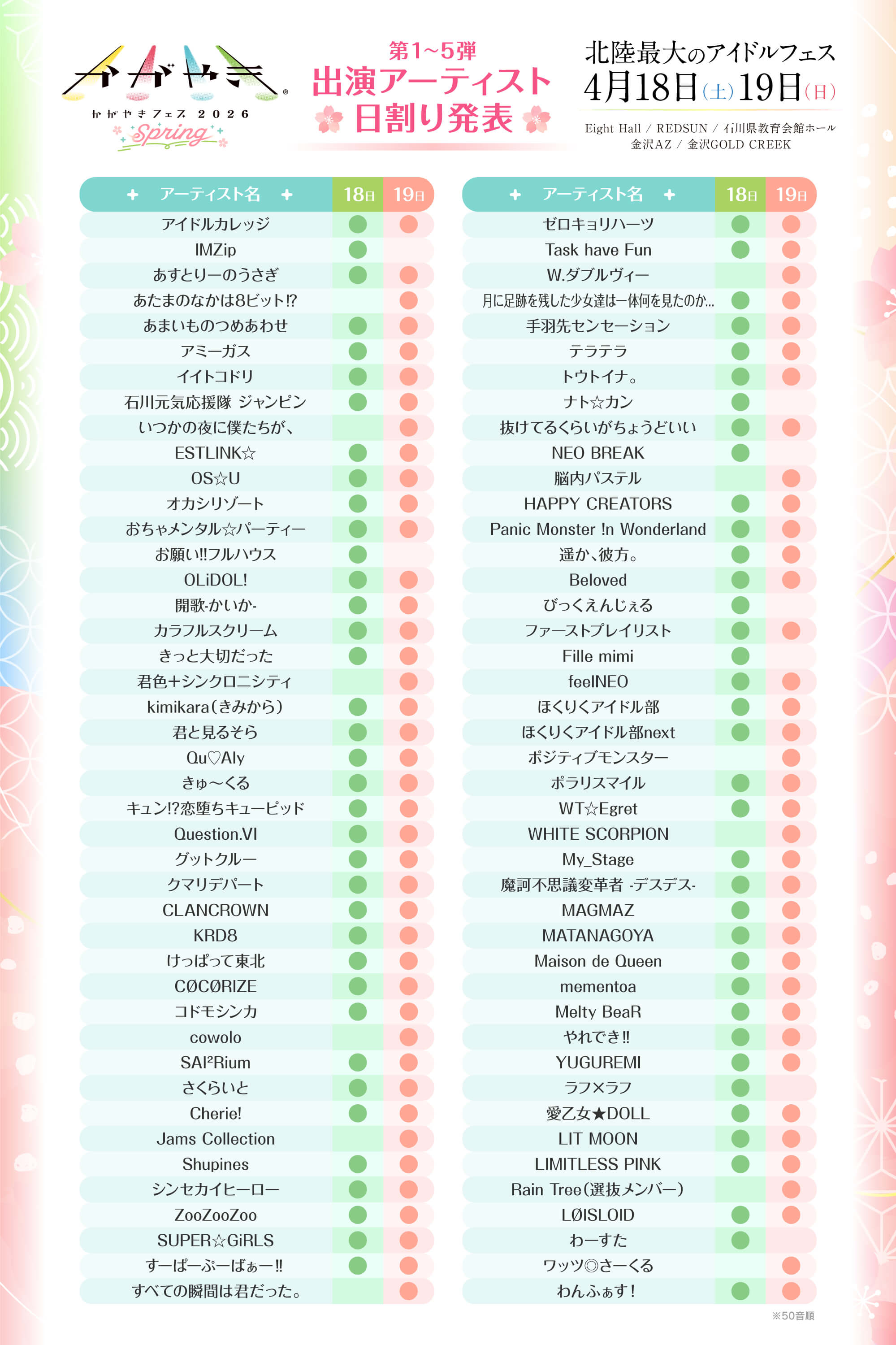 - ※チケットに記載の整理番号順でのリストバンド交換になります。整理番号は土曜:通し券S→18日券Aの順、日曜:通し券S→19日券Bの順になります。